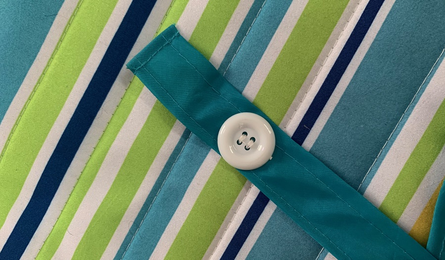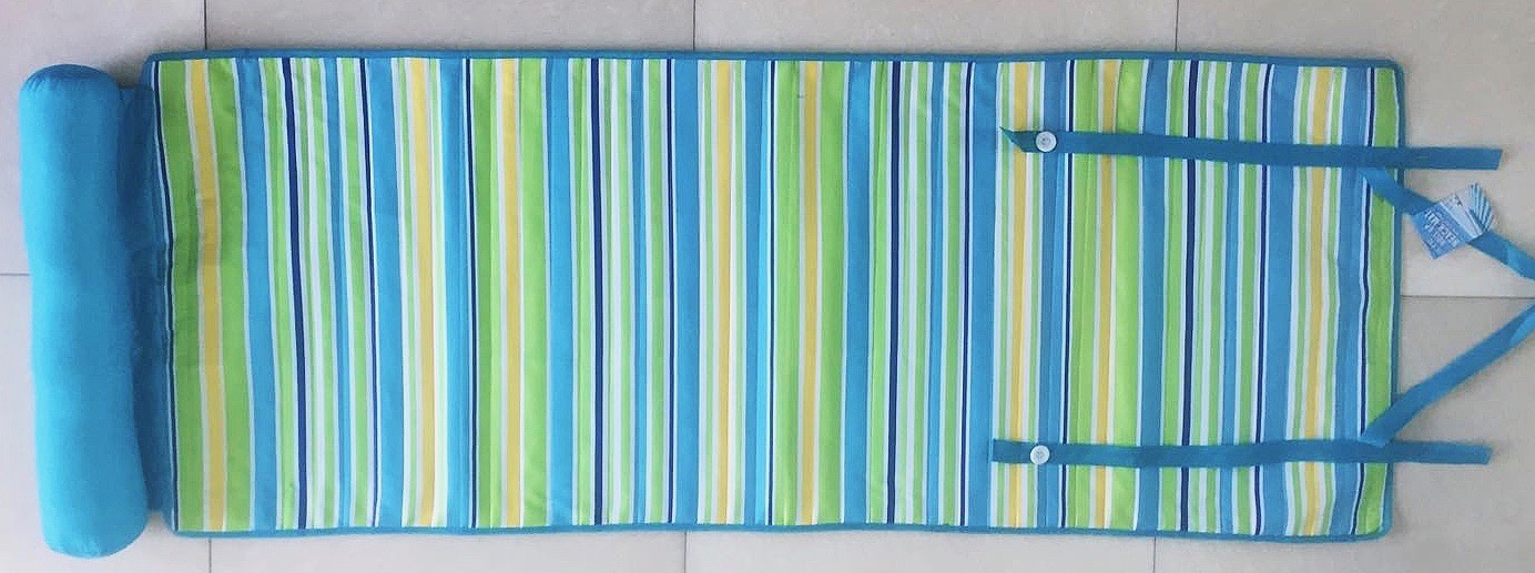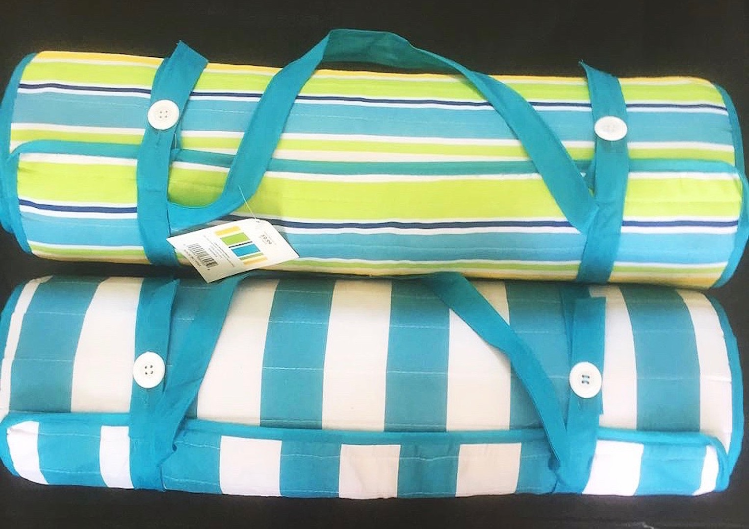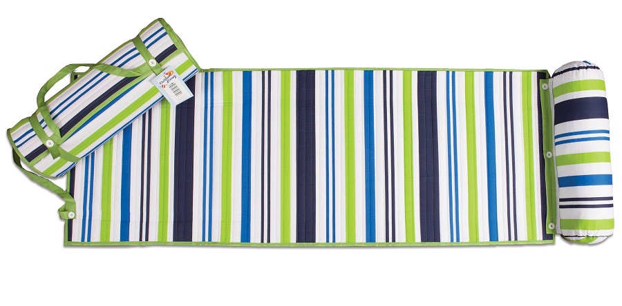 1. Relax in comfort at the beach or pool with this extremely convenient roll-up beach mat. Sporting an attractive blue, green, and white striped pattern, this padded mat includes a detachable pillow for ideal comfort.