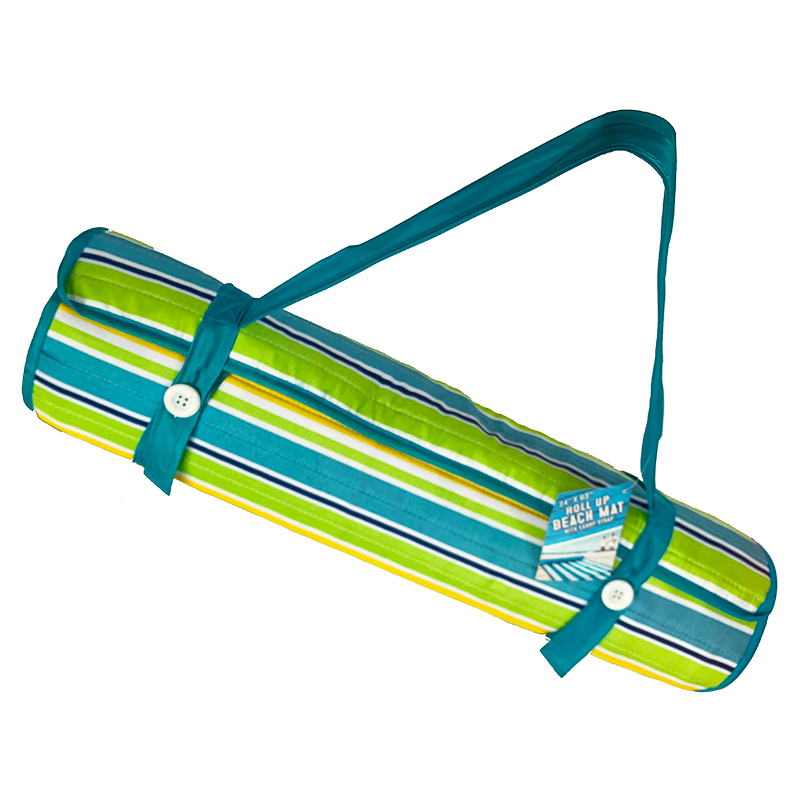 1. Relax in comfort at the beach or pool with this extremely convenient roll-up beach mat. Sporting an attractive blue, green, and white striped pattern, this padded mat includes a detachable pillow for ideal comfort.